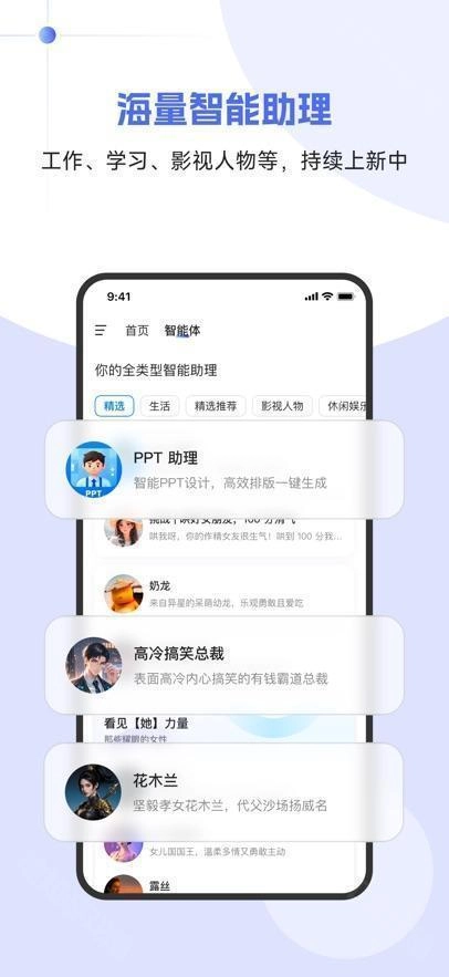 3、于智能体页面,为各位准备了大量全能型智能助理,涵盖各种影视人物、工作学习等不同领域。