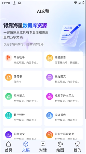 5、于文稿页面,具备毕业助手、任务书、期末范文、教学设计等文本创作功能。