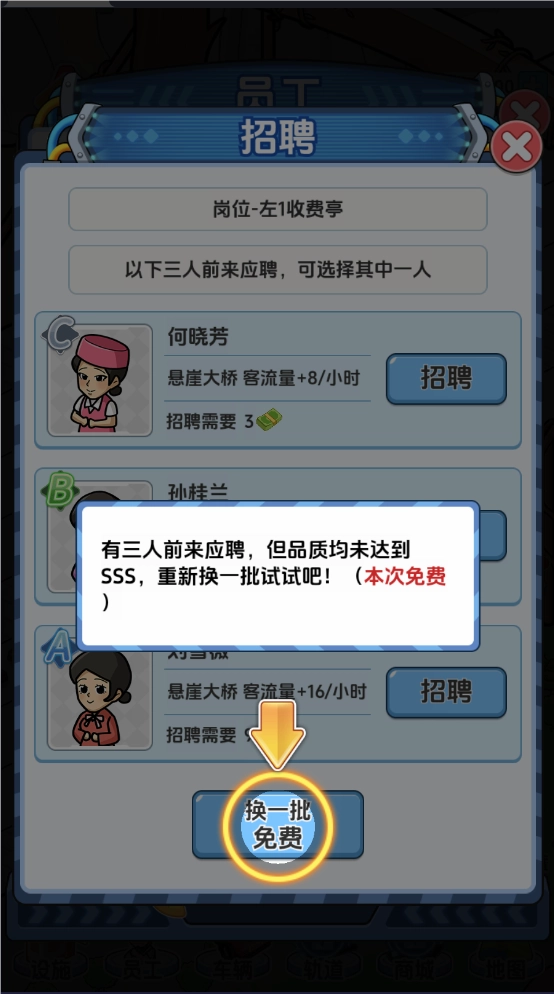 2、玩家可以通过刷新来筛选各种品质的收费员