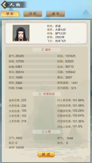 ③魔界:当邪气值达到1000,并且缴纳1万灵石,便可进入魔界。在魔界之中,既能吸取他人的修为,还能够抢夺灵石,而且只要自身实力强于他人,就可以随意将别人踢出魔界,但每天吸取或抢夺的次数最多为5次。魔界完全以实力为尊,若自身没有足够实力,最好不要涉足魔界。 2、①结丹:需消耗1千万修为,耗时2个小时,可转化为50点属性,这些属性是随机生成的。