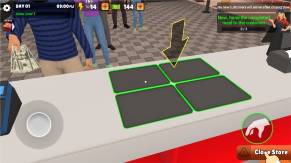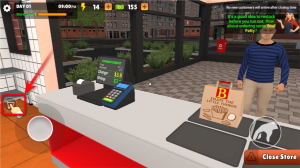 6. 准备好适量经营物资后,前往汉堡店外面的招牌处,点击把“closed”改成“open” 。