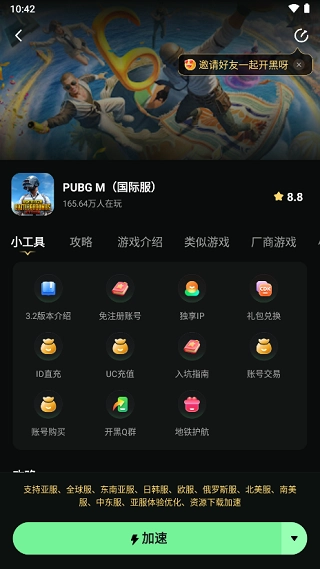 在《PUBG MOBILE》全球服界面,点击“加速”,即可顺利加速PUBG MOBILE国际服。