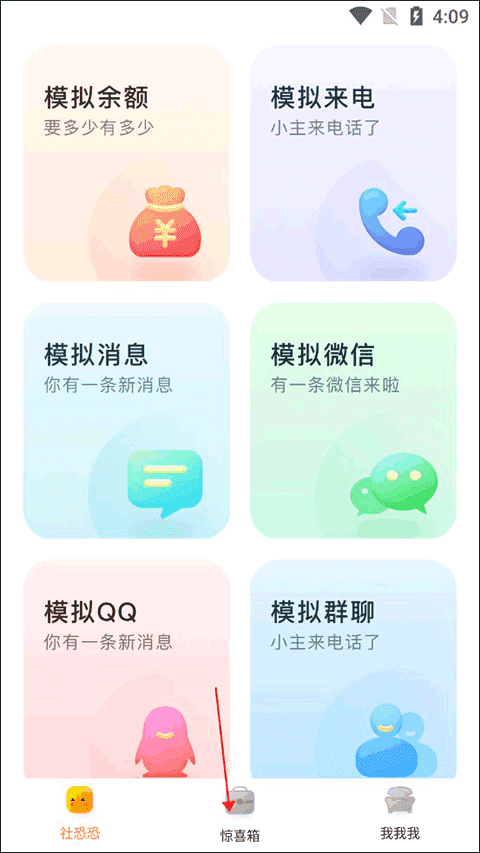 首先,打开社恐快逃后,进入主界面可以看到一系列针对社恐人士设计的功能模块。点击底部导航栏中的“惊喜箱”,即可发现更多隐藏功能。