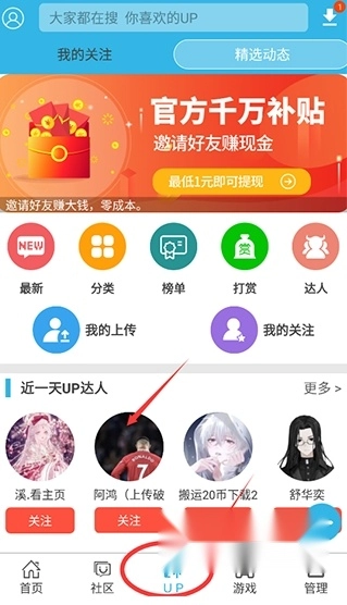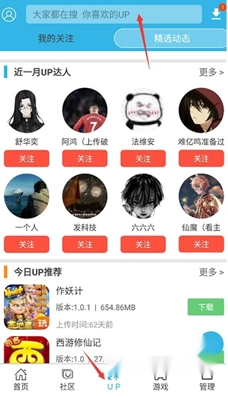 若想找到自己想玩游戏的应用,同样需点击“up”功能按钮。