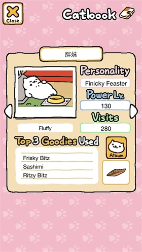 3、贪吃猫胖妹,她每次都能将猫粮吃得一干二净。即便场景里现有的猫不会因她进食而立刻跑开,但要是没有猫粮,就无法吸引新的猫咪到来。要是你心急地在胖妹饭后正养神的时候就把猫粮添满,胖妹就会马上被吓跑。毕竟,把正在玩耍的猫咪赶跑可不是什么好事情。