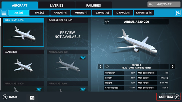 5、在此处挑选一款自己心仪的飞机型号,每架飞机都进行了逼真的模拟设计还原,接着点击【CONFIRM】进入下一步。