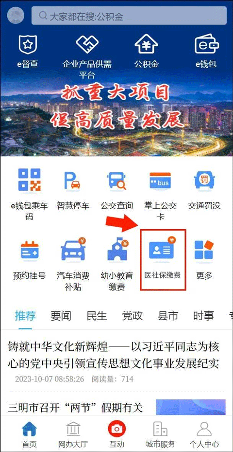 1、打开e三明app,在首页点击【医社保缴费】图标,进入缴费页面。
