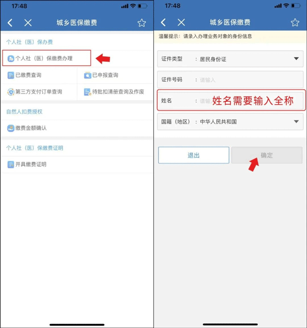 2、进入城乡医保缴费页面后,点击【个人社(医)保缴费办理】,在页面上正确填写证件号码和全名等信息,然后点击【确定】。(温馨提示:请确保输入的是完整的姓名)