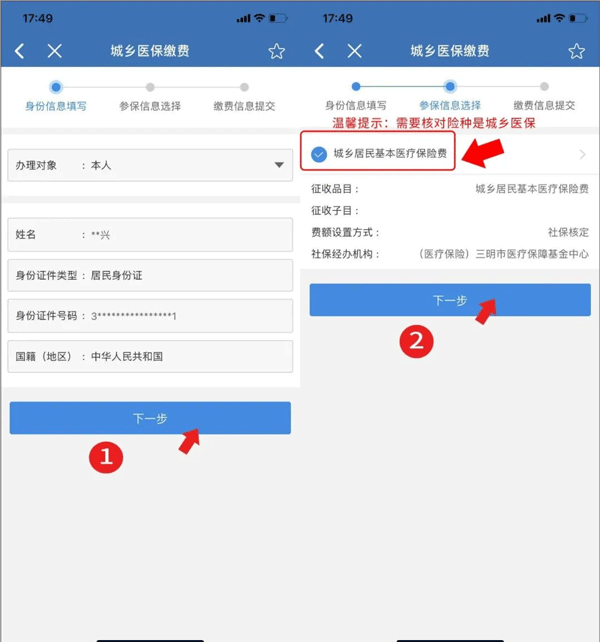 3、请仔细检查页面上的信息,确认无误后,依次点击【下一步】和【提交】。(温馨提示:请特别注意核对险种是否为城乡居民基本医疗保险费)