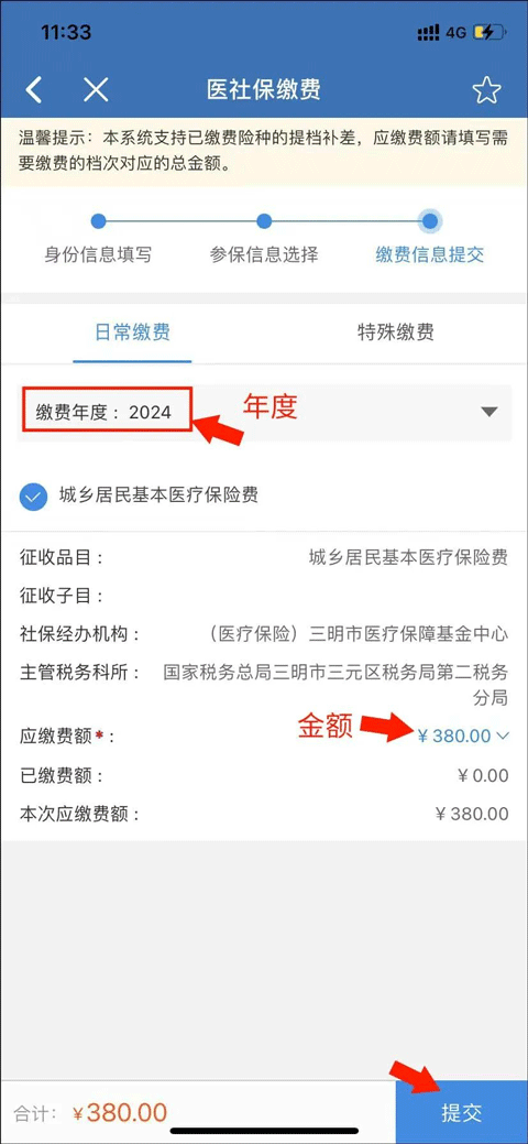 4、仔细核对2024年度缴费金额,点击【提交】。