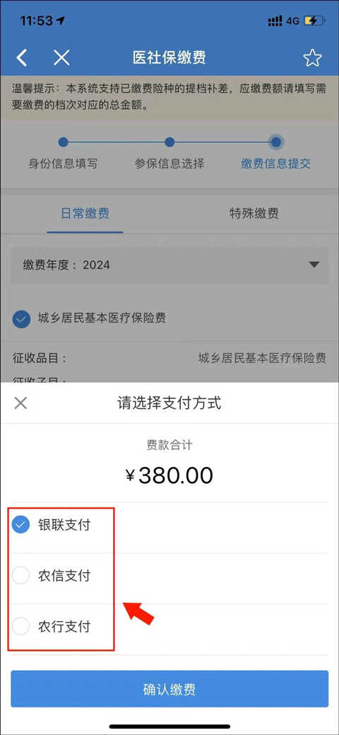 5、根据实际需求选择支付渠道,勾选后点击【确认缴费】。