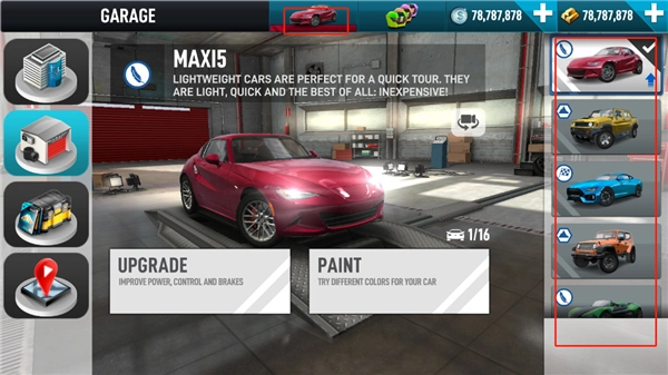 启动游戏后,点击界面上方的汽车图标,玩家就能在右侧挑选自己心仪的车辆。