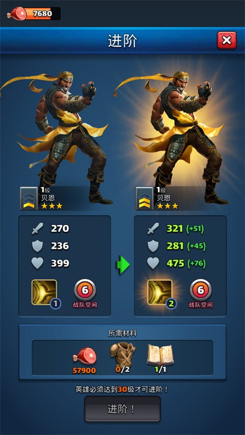 当英雄当前等级达到上限时,你可以选择“升阶(ascend)”来进一步提升它。升阶过程需要消耗不同的升阶材料和食物,这些材料在日常推图时会有一定概率掉落。