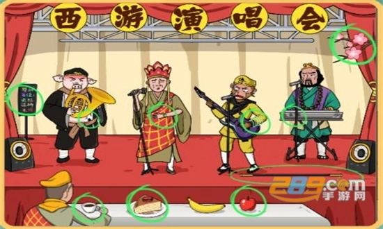 具体位置:图片里唐僧手腕上的【秒针】、桌面上的【蛋糕】【小苹果】【咖啡】,猪八戒腰间的【黑桃A】,舞台上的【金箍棒】、电子琴上的【三两三】、孙悟空手腕上的【五环】,左侧的广告牌【我是云南的】,右上角的【梅花】
