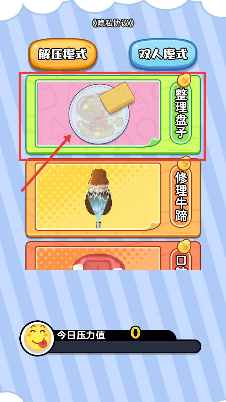 进入【解压模式】后,选定【整理盘子】这一任务,就能开启餐具清洁的解压玩法,借此熟悉相关操作逻辑。