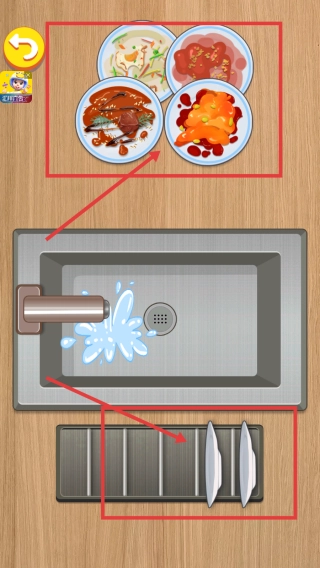 把脏盘子拿到水槽里冲洗干净,之后放到下方的【沥干区】,这样就完成了餐具整理的步骤。