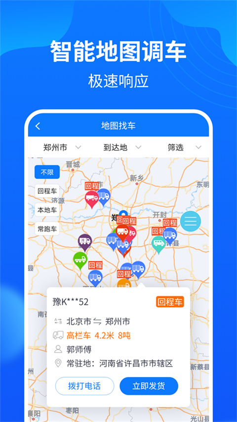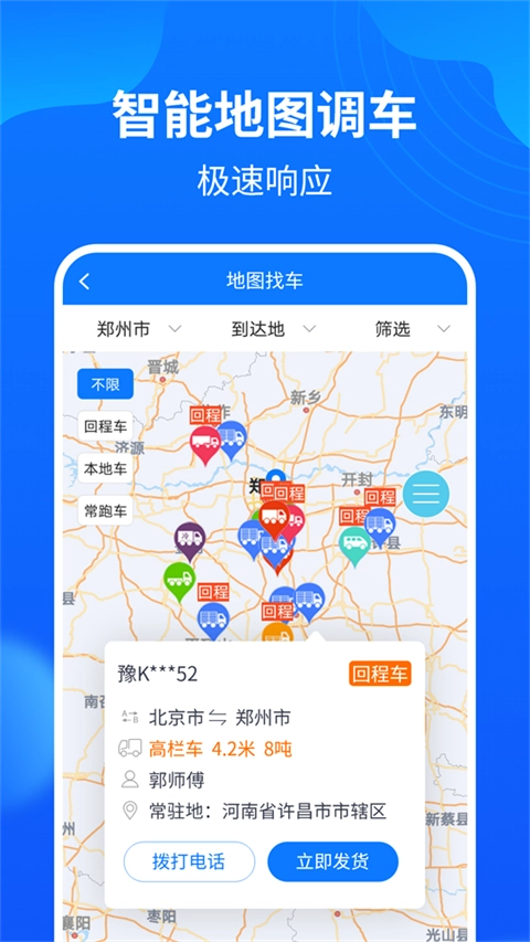 地图找车:借助地图找车功能,能够迅速调配全国范围内的回程车与常跑车。