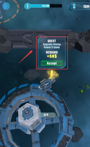 接受采矿升级任务,消耗10M金币可提升能量值至214/350。
