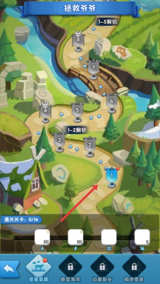 关卡选择:进入“拯救爷爷”地图,选择关卡1,开启冒险之旅。