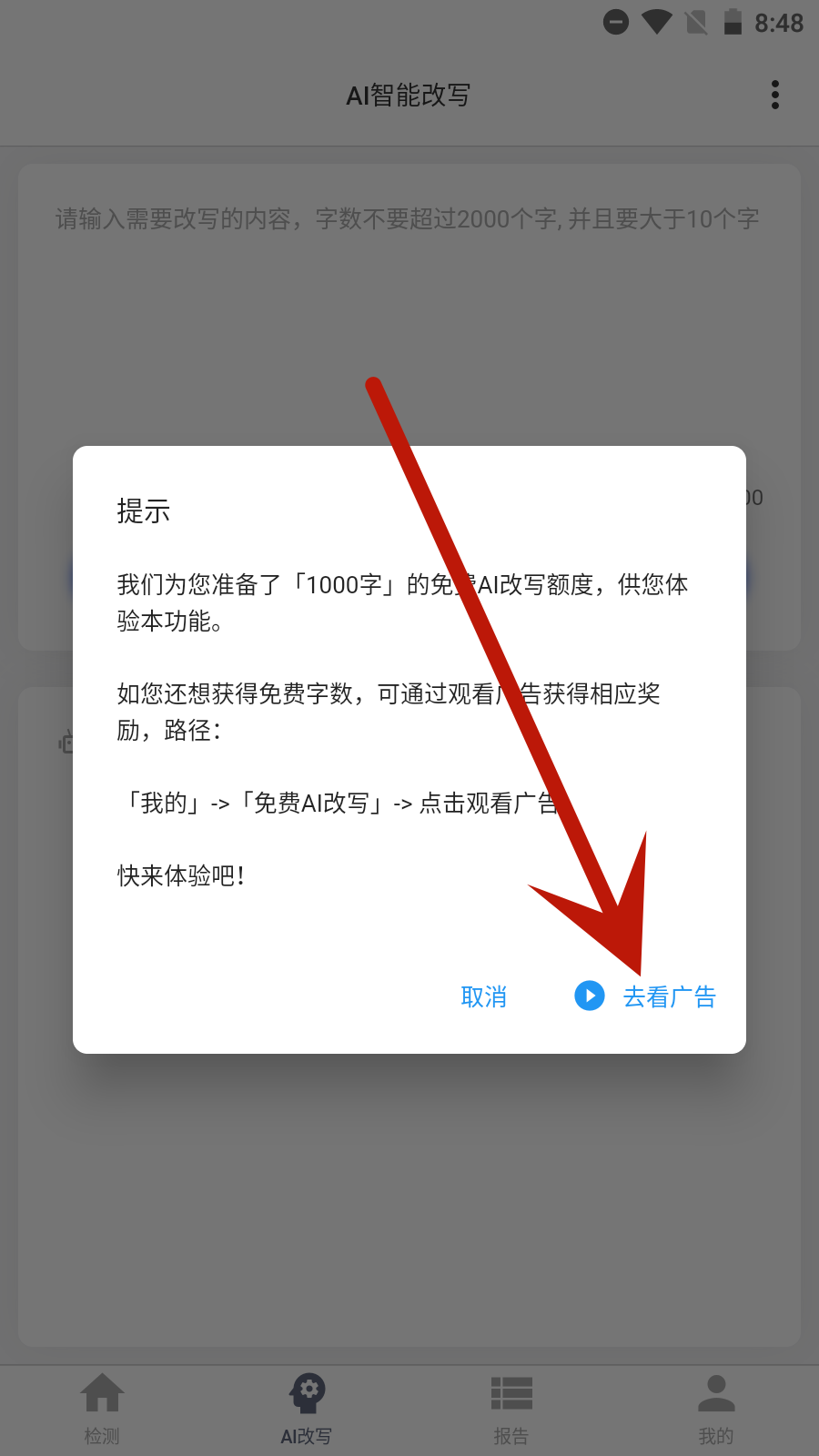 点击【去看广告】,观看完毕后即可获取免费AI智能改写字数