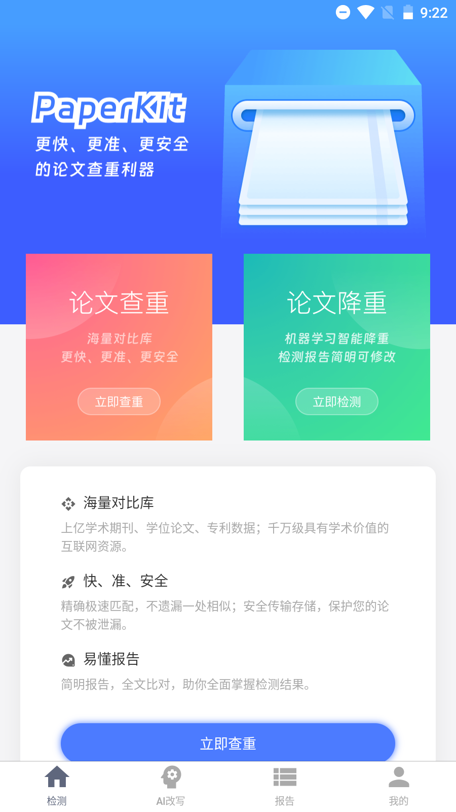 PaperKit论文查重是一款专业、高效且安全的论文检测工具,致力于为用户提供优质的查重服务与降重辅助支持。