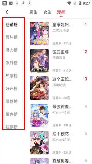 回到首页后,能看到种类丰富的图书分类,像精选推荐、男生专区、女生专区、漫画栏目之类的都有。