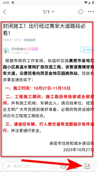 在帖子详情页面,点击右下角的分享图标后,会弹出分享选项。