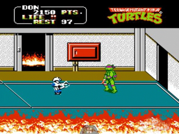 过关技巧:可以站在boss身旁用普通攻击,boss被攻击时不会攻击忍者龟,但要留意躲避boss的子弹,通常损失两条命就能过关了。