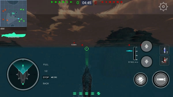 点击「下潜」按钮能让潜艇逐步下潜,点击「上浮」按钮可使潜艇逐步上浮,潜艇的深度可通过这两个按钮进行调节。