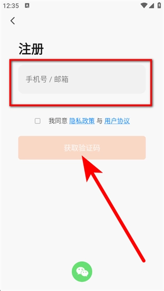 在注册页面,输入手机号码,勾选相关选项后,点击获取验证码按钮。