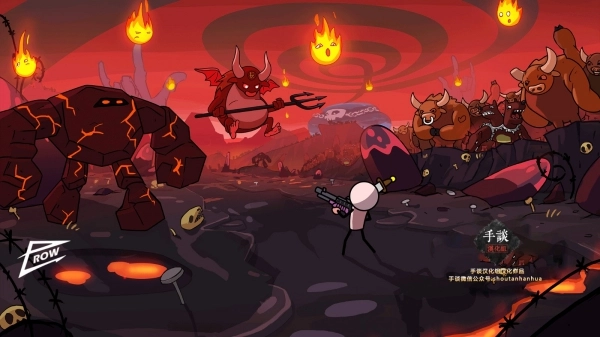 你的身旁有一群恶魔、蛮牛、火球之类奇形怪状的生物朝你发起攻击。