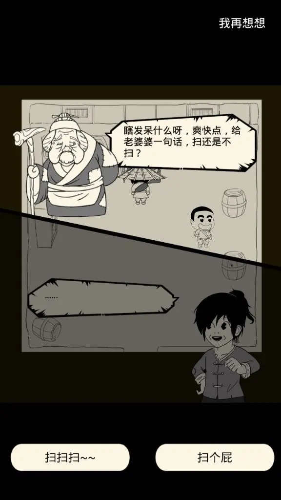 出生后先与神秘人交谈,接着前往右上角获取上吊用的麻绳(这是关键物品),之后出门往左走找到老奶奶家,和老奶奶对话后,她会让你帮忙扫地。