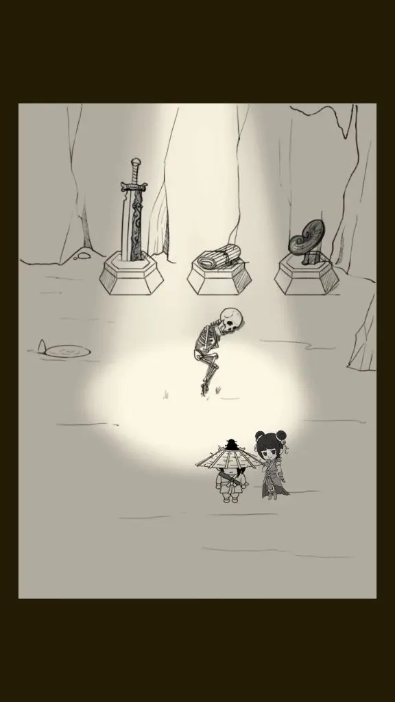 点击骸骨进行收搜,与慕容对话,他会让你从屠龙宝刀、万年灵芝、九阴神功这三样宝贝中选择一样。