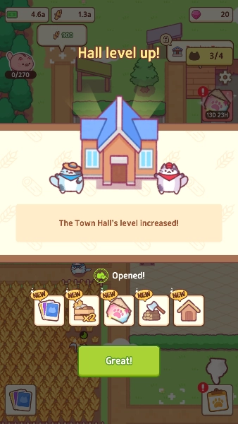 猫镇山谷是一款治愈系休闲小游戏。玩家初次进入游戏时,需先选择自己的小镇来饲养猫咪。为猫咪安排好住处后,只需耐心等待它们成长,就能和你一同打造这座充满温馨感的小城。游戏中,玩家通过获取金币来升级小城的各类设施,进而获得更丰厚的资源回报。