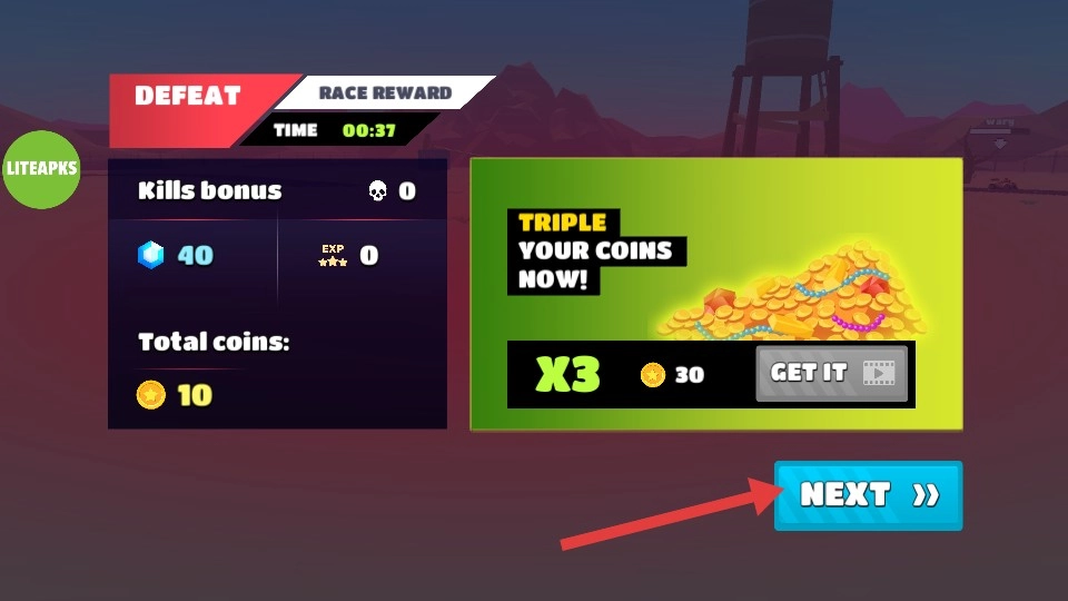 比赛结束后点击【NEXT】按钮,继续进行挑战,以此积累金币和经验,从而提升赛车的实力。