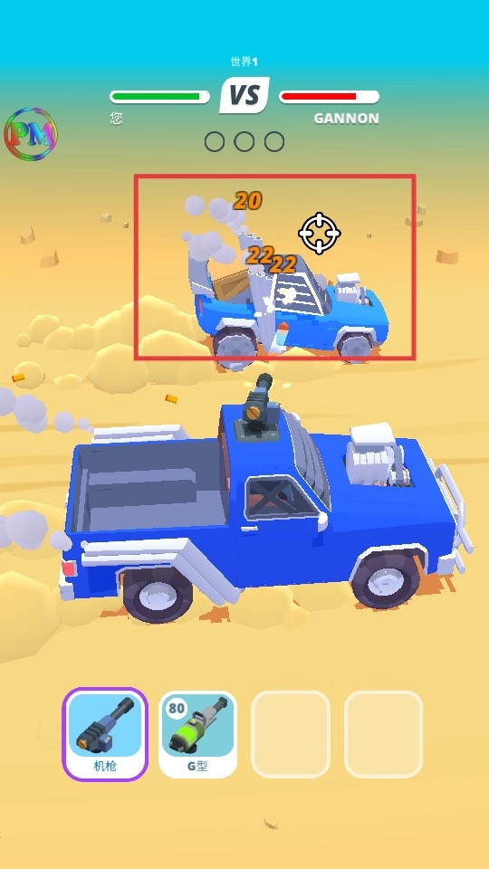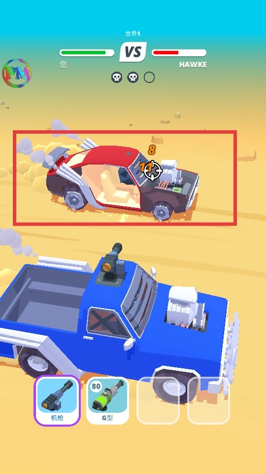 战斗时【长按屏幕】对准敌方的蓝色车辆,使用机枪这类武器进行射击,迅速减少它的血量来赢得胜利。