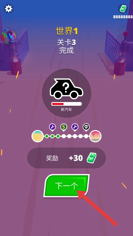 关卡完成后,点击【下一个】按钮进入下一关,可获得金币奖励并解锁新汽车。