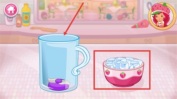 制作的首要步骤,是把右侧【草莓碗装冰块】添加至杯子内,以此完成基础材料的准备工作。