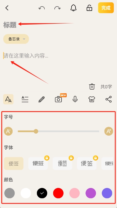 在添加记录的界面中,你可以输入备忘的标题与内容,还能够对字体的样式、颜色等格式进行调整。