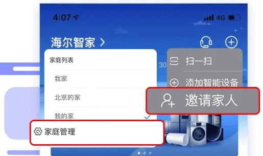 点击首页顶部的【家庭管理】选项,然后选择邀请家人。即便没有绑定家电,也能够在不同家庭之间实现家电的分享与智能控制。