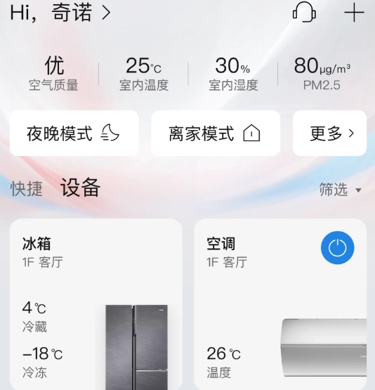 点击右上角的“≡”按钮,接着选择“添加智能设备”选项,就能完成设备连接;之后便可便捷实现家电的远程操控、信息查询、状态提醒与能耗管理,尽情享受智慧家庭的场景体验。