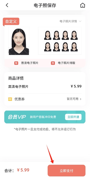 请先查看支付相关信息,在确认所有内容准确无误后,点击“立即支付”按钮。待支付流程完成,您就可以导出照片了。