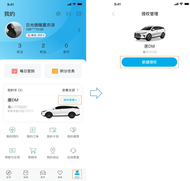 打开比亚迪汽车App,依次进入【我的】页面、【授权管理】选项,再点击【新建授权】。