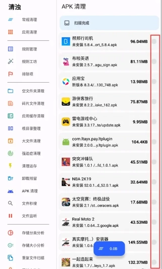 选择清理项:扫描结束后,手机里的所有APK文件都会呈现出来,你可以勾选想要删除的软件或者游戏。