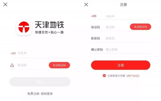 之后,在“天津地铁”首页,通过手机号加验证码的方式完成快速注册。