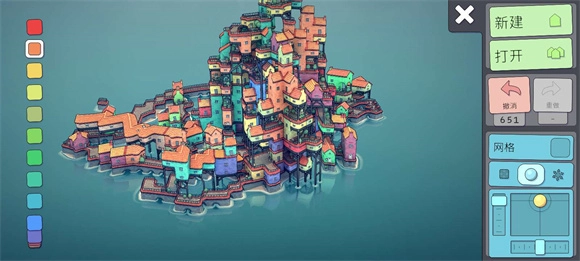 点触屏幕就能让一座建筑物落下,还伴有水花特效,玩起来特别解压。建筑物落地后相互碰撞会自动融合,相邻的建筑也会彼此融合。建筑能不断向上堆叠增高,也能向左右两侧延伸扩展,而且还可以调节颜色,总共有三种不同的画风可选,同时能调整光线的角度和亮度。这款游戏在视觉呈现上做得相当出色,这也是它的一大亮点。