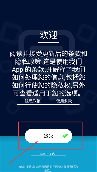 进入应用的欢迎界面后,仔细阅读《隐私政策》和《使用条款》,随后点击“接受”按钮,就能完成协议确认并进入应用。