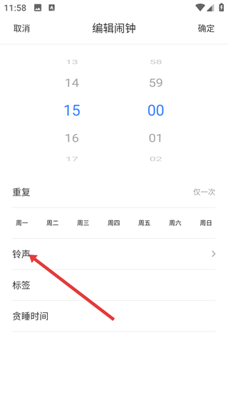 进入闹钟编辑界面后,先通过滑动操作将时间调整到想要的数值,接着点击【铃声】选项,就能进入铃声设置页面了。