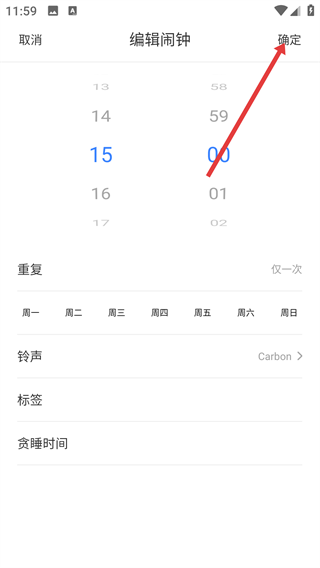 确认时间、铃声等相关设置后,点击右上角的【确定】按钮,即可保存并启用该闹钟。