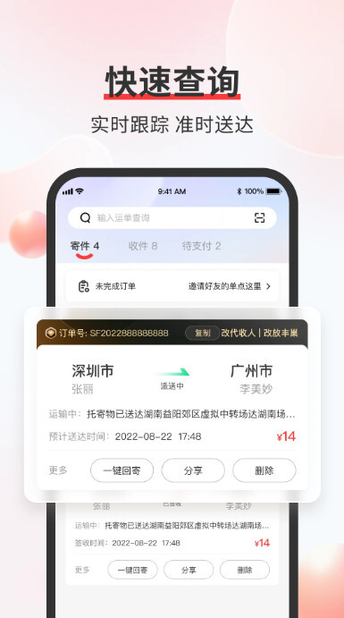 顺丰速运是一款非常实用的手机寄收快递软件,它不仅支持手机便捷下单,还提供网点查询、运费查询、订单管理等一站式自助服务;通过线上填写信息,无需担心字迹潦草导致寄件失败,加上常用地址一键选择的功能,让用户寄件收件更省心安心。